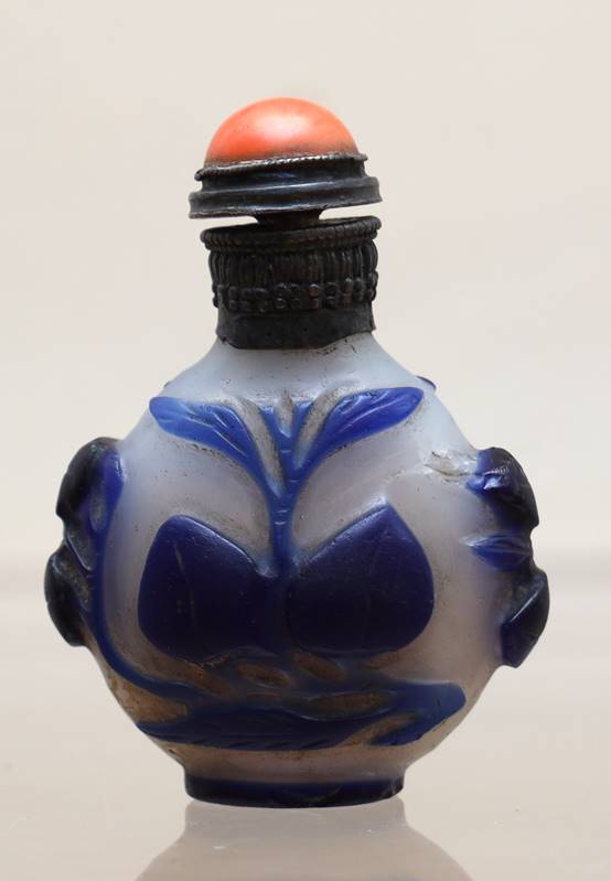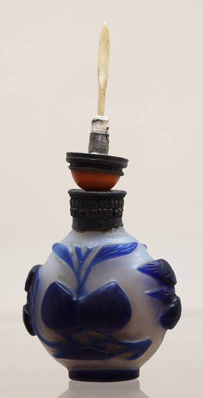 Snuff Bottle China Qing-Dynastie. Glas mit blauem Überfang, geschnitten, mit Metallmontur. Größe ca. 5,5 x 3,5 cm. Höhe ca. 6,5 cm.