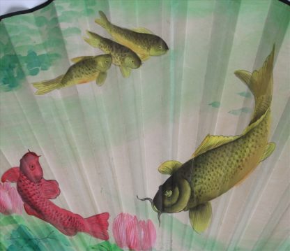 China 20. Jh. Szenen mit diversen Kois auf Papier handgemalt. Ebonisiertes Holz und bemaltes Papier. Seitlich Signaturen. Länge gesamt ca. 92 cm, Fächer ca. 55 cm.