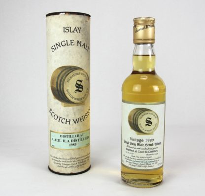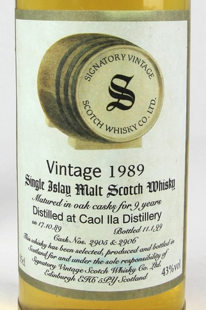 Signatory Vintage 1989. Single Islay Malt Scotch Whiskey. 9 Jahr im Eichenfass gereift. In der Caol Ila Destillerie destilliert am 17.10.1989, am 11.1.1999 in die Flasche gefüllt. Fass Nummer 2905 und 2906. 35 cl. Füllstand Mitte des Halses. In Original Pappbox.