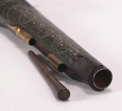 Steinschloßpistole 17./18. Jh. Duellpistole. Metallschaft, Holzlauf mit Silberintarsien in floralem Muster und Goldauflagen, mit Ladestock. Länge ca. 47 cm, Gewicht ca. 1100 Gramm.