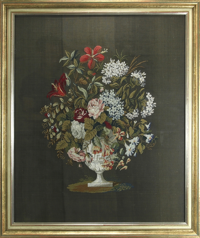 Stickbild 19. Jh. Garn. Gesticktes Blumenstillleben. Größe ca. 64 x 52 cm, hinter Glas gerahmt ca. 73 x 60,5 cm. Guter Zustand.