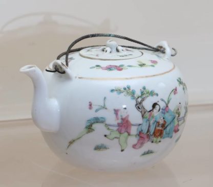 Teekanne China Qing Dynastie. Figurale Famille verte Malerei. Unter dem Boden Tongzhi Marke. Größe ca. 16,5 x 12 cm, Höhe ca. 10 cm. Teils berieben, am Ausguss altrestauriert