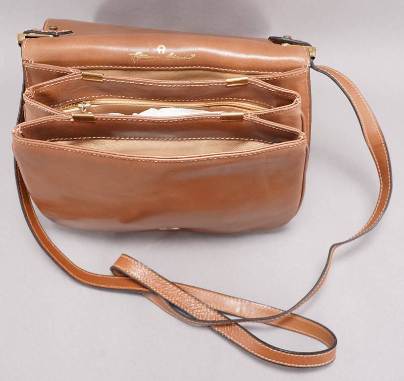 Etienne Aigner München. Schultertasche aus braunem Leder, aufklappbar mit drei Innenfächern, ebenso mit ledernem Innenfutter. Schauseitig mit Herstellerbezeichnung in Form eines Hufeisens, innen mit Schriftzug bezeichnet. Größe ca. 23 x 4 cm, Höhe ca. 22 cm. Guter Zustand wie abgebildet.