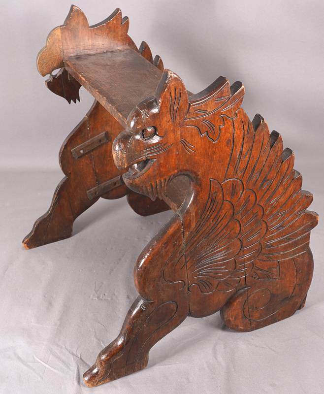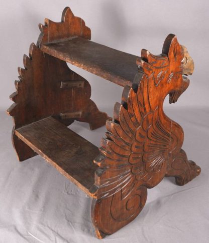 Bibliothekstritt Wohl England 19. Jh. Weichholz, teils reliefplastisch geschnitzt. Seitenteile Chimären darstellend. Größe ca. 43 x 40 cm, Höhe ca. 44,5 cm.