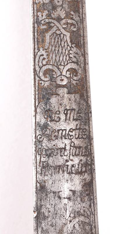 Beamtendegen Frankreich 18. Jh. Messinggriff reliefiert. Klinge mit Zierätzung und französischer Inschrift. Gesamtlänge ca. 80 cm, Klinge ca. 65 cm. Gewicht ca. 480 Gramm. Griff etwas gelockert. Altersbedingter Zustand.