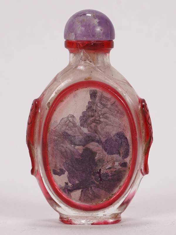 Snuff Bottle China wohl Qing-Dynastie. Glas mit rotem Überfang, geschnitten. Innenwandmalerei. Größe ca. 5 x 2 cm. Höhe ca. 7,5 cm. Gebrochen und geklebt.