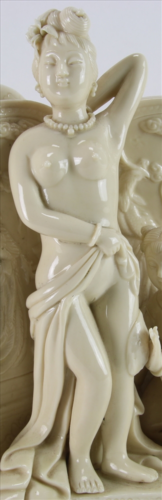 China 19./20. Jh. Würdenträger hinter einer Wand stehend schaut einer Kurtisane mit Dienerin beim Baden zu. Porzellan. Größe ca. 16,5 x 12,5 cm, Höhe ca. 22 cm. Teils etwas bestossen.
