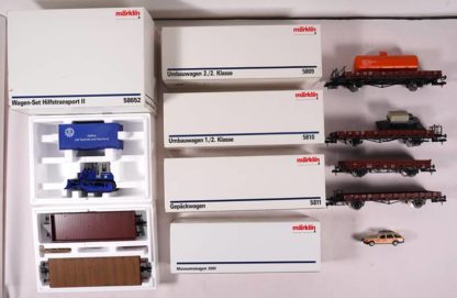 Märklin: Wagen-Set Hilfstransport II, OVP 58652. Gepäckwagen, OPV 5811. Museumswagen, OVP 2001. Umbauwagen 1./2. Kl., OVP 5810. Umbauwagen 1./2. Kl., OVP 5809 und vier Niederbordwagen ohne OVP, teils mit Beladung. Aus einer süddeutschen Privatsammlung. Zustände wie abgebildet, Funktion nicht geprüft, teils eventuell Fehlteile, teils eventuell beschädigt. Bitte selbst besichtigen.