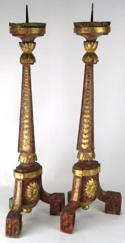 Empire-Stil. Holz geschnitzt, polychrom gefasst. Größe jeweils ca. 15 x 22 cm, Höhe jeweils ca. 61 cm.