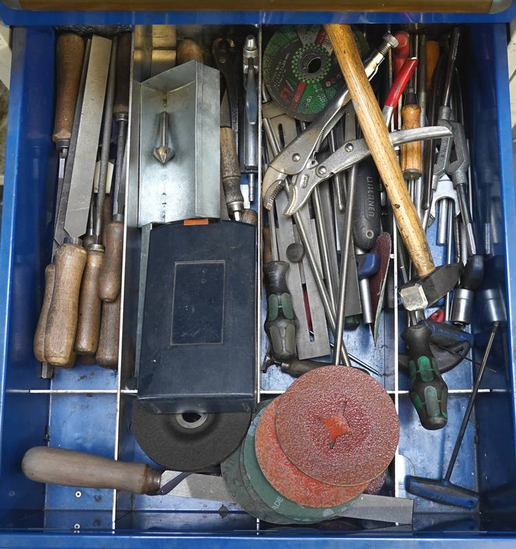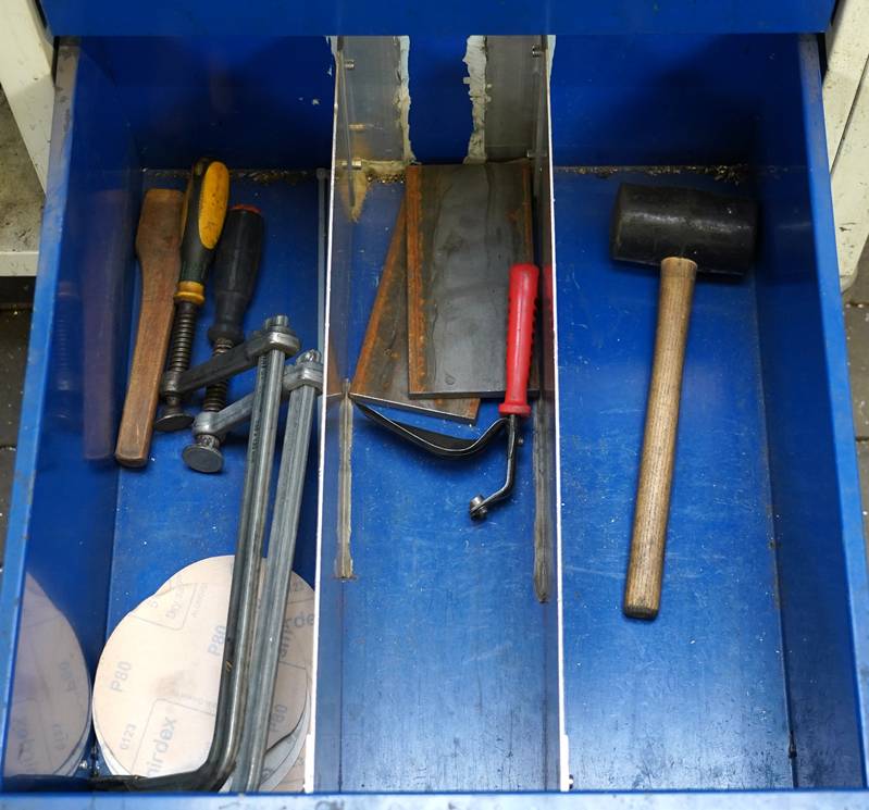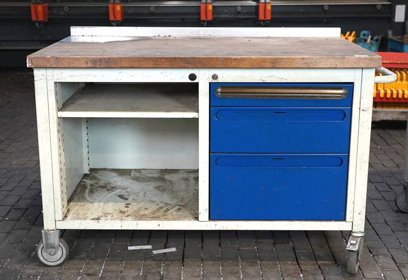 Werkbank mobil ca. 130 x 70 cm. Gefüllt mit Werkzeug und Verbrauchsmaterialien.