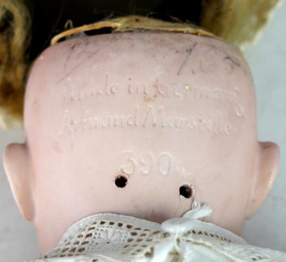 Mädchenpuppe 390. Kurbelkopf aus Biskuit-Porzellan mit blauen Schlafaugen, offenem Mund und sichtbarer oberen Zahnreihe. Kopf mit Pappdeckel und blonder Perücke. Kugelgelenkkörper mit festen Handgelenken. Alte Kleidung. Auf dem Hinterkopf bezeichnet Made in Germany Armand Marseille 390 n. Größe ca. 50 cm. Perücke ist lose. Zustand wie abgebildet.