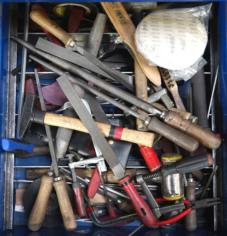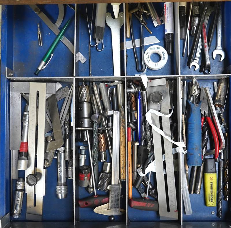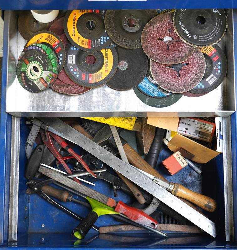 Werkbank mobil ca. 130 x 70 cm. Gefüllt mit Werkzeug und Verbrauchsmaterialien.