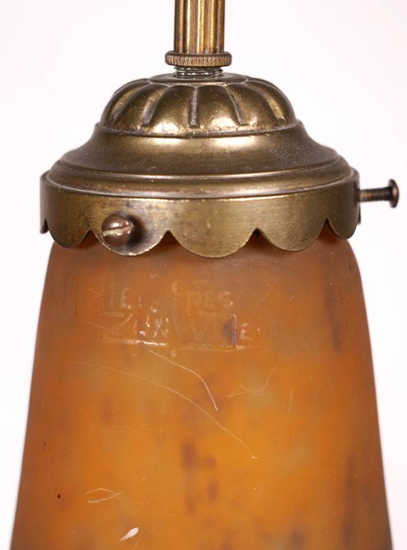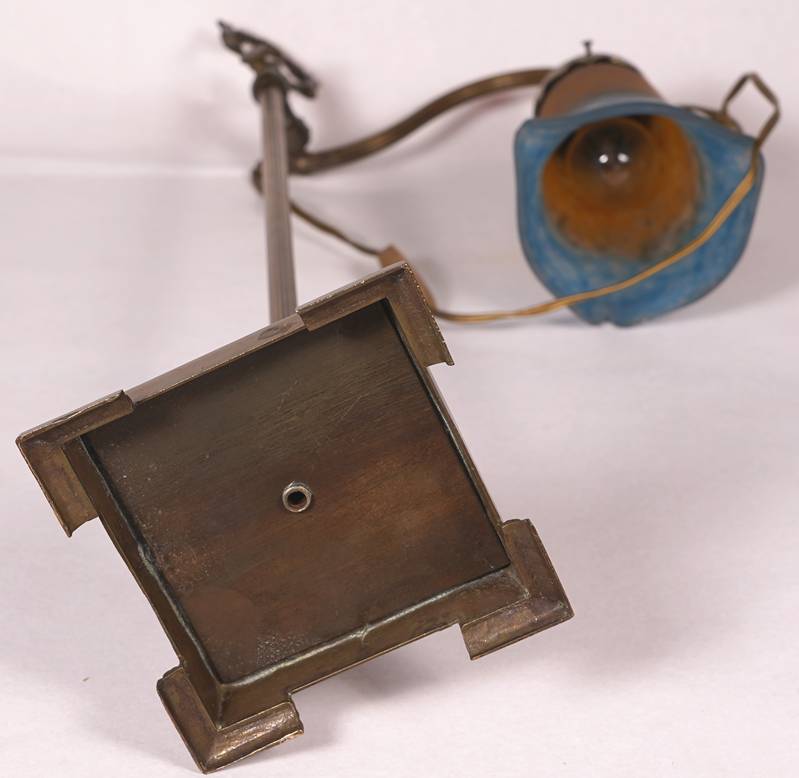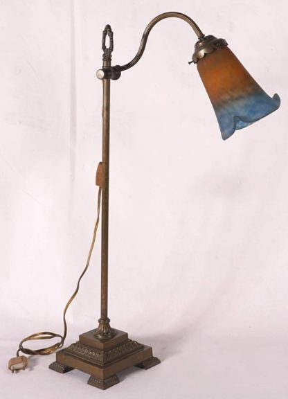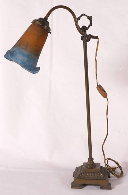 Jugendstil Tischlampe Frankreich um 1920. Muller Frères, Lunéville. Tischlampe mit Metallfuß und farbigem Lampenschirm aus Glas. Quadratischer Fuß mit stabförmigem Schaft mit Tragering. Höhenverstellbarer und schwenkbarer Arm. Der Lampenschirm in Form eines Blütenkelchs mit Pulvereinschmelzungen in Orange und Blau, dreifach gekniffen. Darauf mit Ätzmarke "Muller Frères Luneville". Größe ca. 30 x 20 cm, Höhe max. ca. 65 cm. Funktion nicht getestet.
