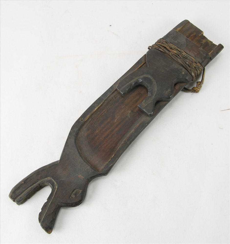 Wohl Zentralafrika um 1900. Holz, Metallschneide und Bast. Größe gesamt ca. 44 x 6,5 cm. Guter Zustand. Tribal Art.