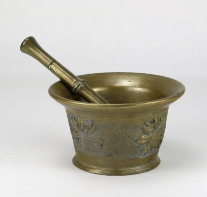 Mörser mit Pistill Um 1900. Bronze. Mörser mit Blumenrelief. Durchmesser ca. 11 cm, Höhe ca. 6,5 cm. Länge des Pistills ca. 14,5 cm. Gesamtgewicht ca. 0,96 kg. Kerbe am Rand des Mörsers.