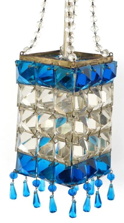 Jugendstil Deckenlampe Deutsch 20. Jh. Quadratischer Rahmen, daran eng montierte, quadratisches Glas in Blau und farblos. Am unteren Rand mit blauem, hängendem Glas geschmückt. Eine Brennstelle. Größe ca. 12 x 12 cm, Höhe ca. 62 cm. Funktion nicht geprüft.