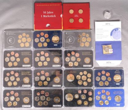 7 x Euro-Premiumsatz (darunter Vatikan), 1 x Prestige Münzsatz (Zypern), 1 x Prestige Specimensatz (Irland),2 x Sonderedition (Griechenland und Zypern),1 x Euro-Spezialsatz (Malta), 2 x Kursmünzensatz (Zypern und Malta). Dazu eine 20 Euro Münze. Silber 925 in der Kapsel, Heft "50 Jahre 1 Markstück" mit vier 1 Mark Stücken und eine 2 Euro Gedenkmünze. Zustand wie abgebildet, bitte selbst besichtigen.