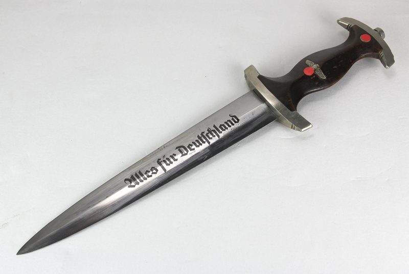 Deutsch, 20.Jh. Hersteller Aesculap-Werke, Jetter & Scheerer, Tuttlingen. SA Dienstdolch mit braunem Holzgriff mit Emblemen in brauner Scheide. Klingeninschrift "Alles für Deutschland", Gebietszeichen auf der Parierstange. Klingenlänge ca. 22,5 cm, Gesamtlänge ca. 37 cm. Gewicht ohne Scheide ca. 251 Gramm. Guter Zustand.