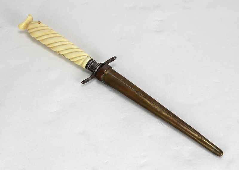 Deutsch um 1900. Bein und Metall. Vierkantklinge in Messingscheide mit Initiale P., beweglicher kleiner Parierstange und spiralig geschnitztem Beingriff. Länge der Klinge ca. 12 cm, Gesamtlänge ca. 22 cm. Gesamtgewicht ca. 90 Gramm. Altersbedingte Patina.