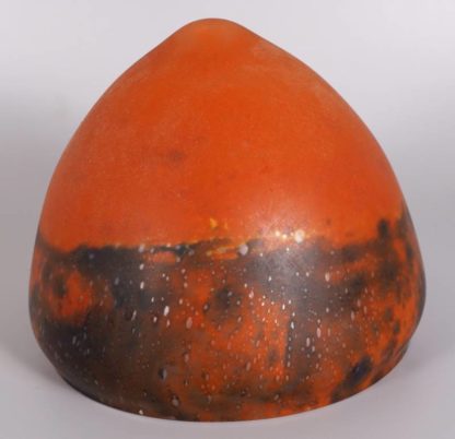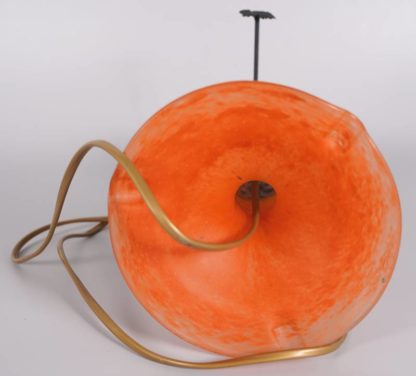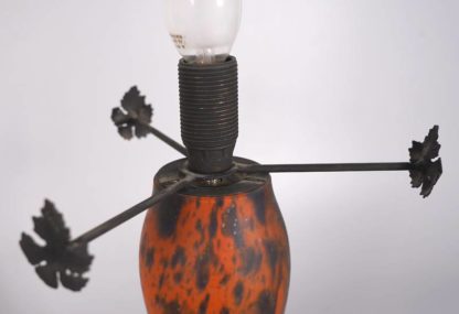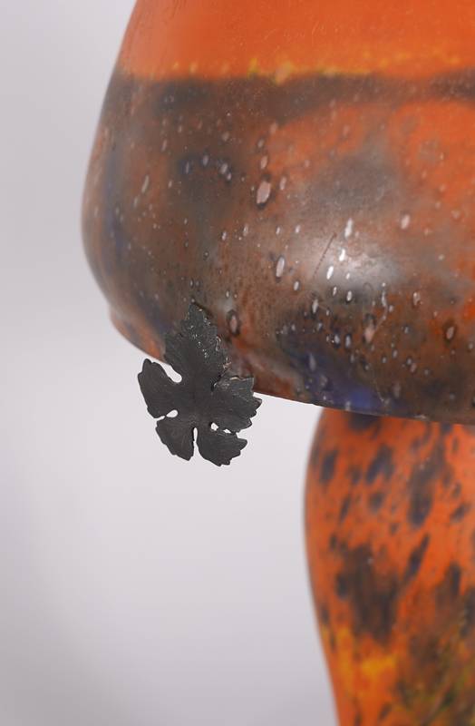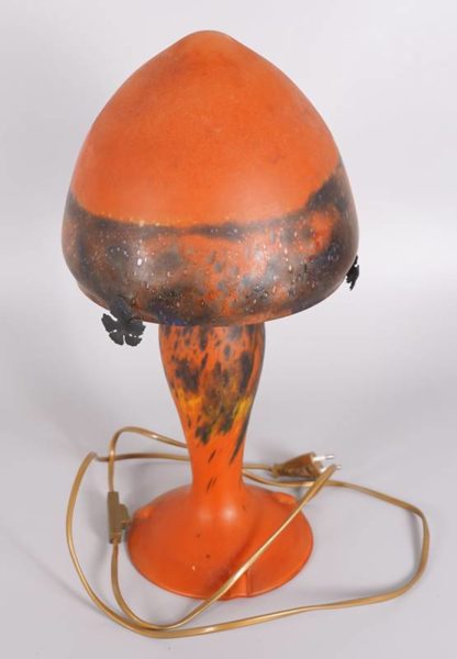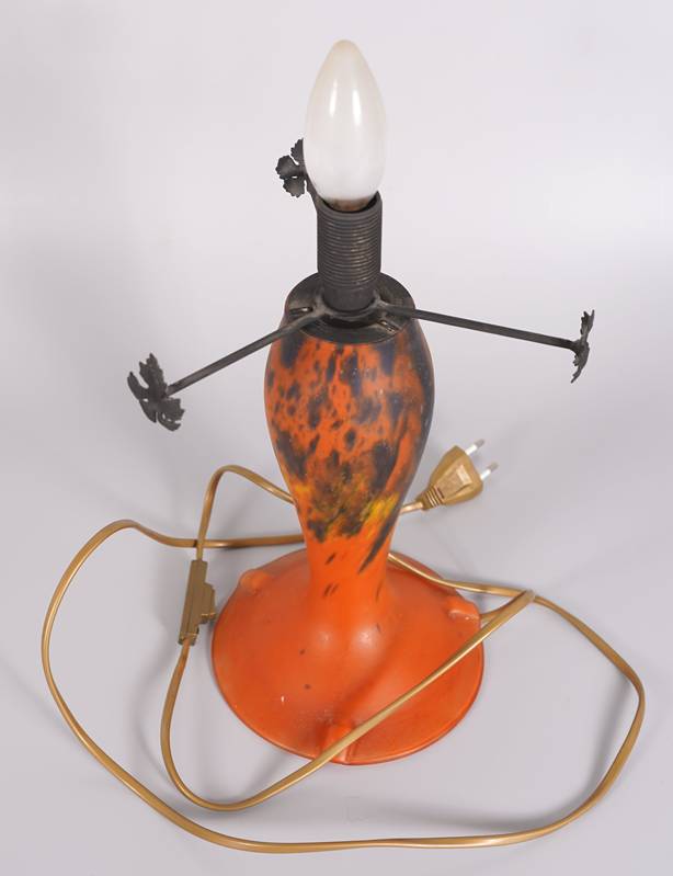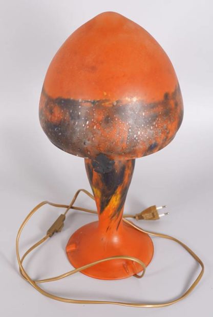 Jugendstil Tischlampe Wohl Frankreich um 1900. Glas mit orangefarbenen und dunklen Einschmelzungen. Ausgestellter Fuß mit ballusterartigem Schaft und pilzförmigem Schirm. Durchmesser des Schirms ca. 22 cm, Höhe ca. 42 cm. Altersbedingter Zustand wie abgebildet, Funktion nicht geprüft.