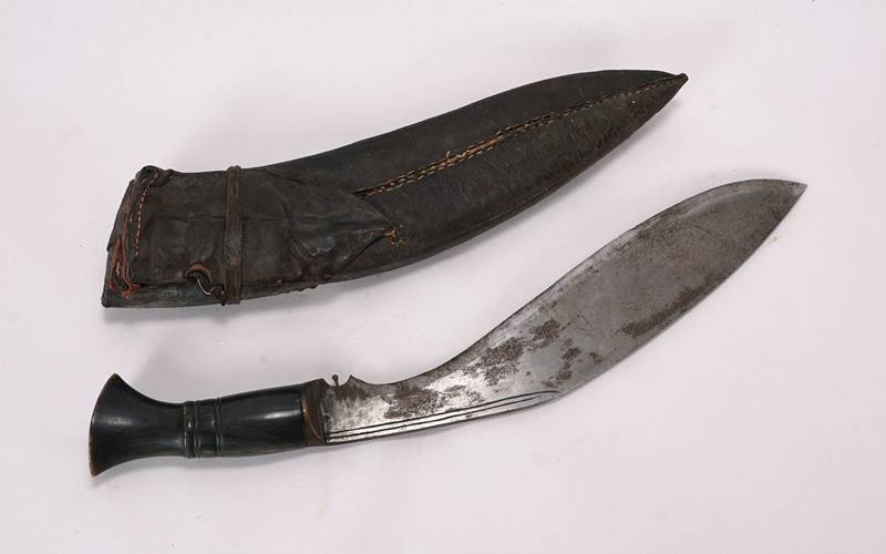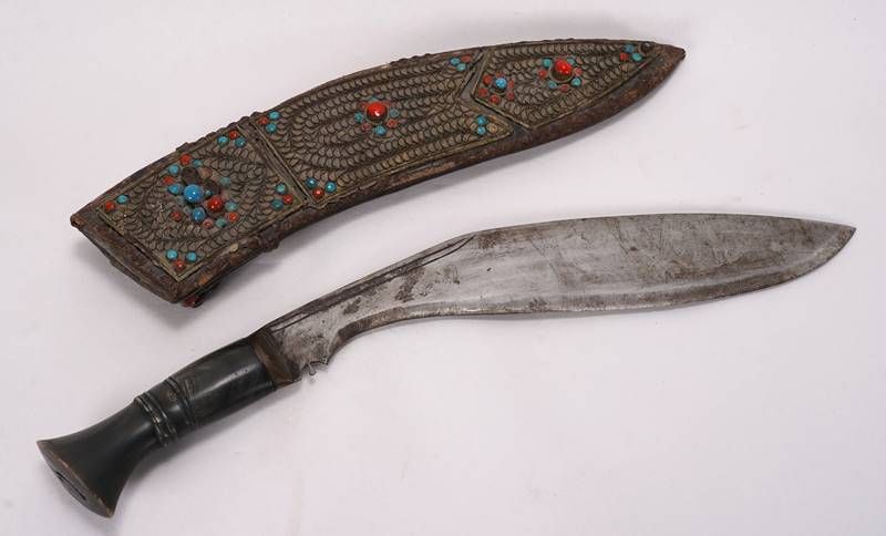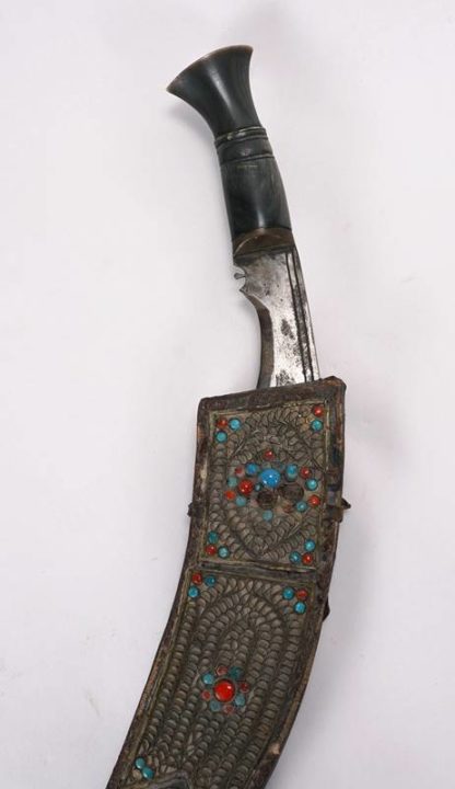 Wohl Indien 19. Jh. Griff aus Horn. Gekrümmte, einschneidige Klinge. Lederscheide mit nicht gefüllten Werkzeugtaschen, Metallapplikation, filigranem Dekor und eingelegten Steinen. Gesamtlänge mit Scheide ca. 42,5 cm, Klinge ca. 28 cm, Gewicht ca. 560 Gramm. Altersbedingter Zustand. Schmucksteine fehlen teils.