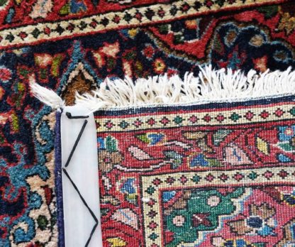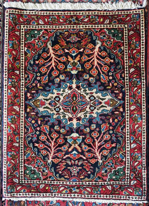 Wolle. Zentrale Blüte im Innenfeld auf hellem Grund, umgeben von floralem Dekor auf dunkelblauem Grund und Eckzwickeln auf rotem Grund. Umgeben von drei Bordüren. Ca. 4 x 4 Knoten/qcm, Größe ca. 85 x 65 cm.