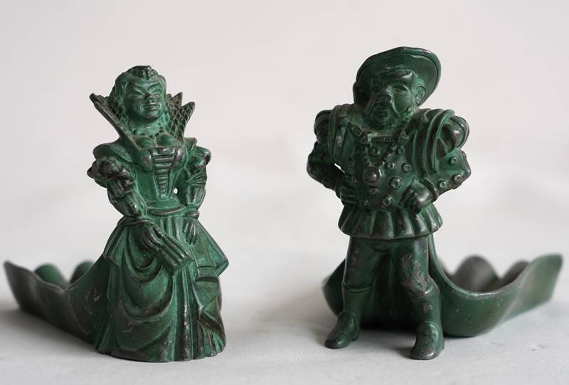 1922 Paris - 1996. Zwei Vide-Poche in Form eines mittelalterlichen Paares mit zu Schalen geformten Umhängen. Metall, grün patiniert. Je unter dem Boden signiert. Größe ca. 11 x 7 cm, Höhe je ca. 11 cm. Teils berieben.