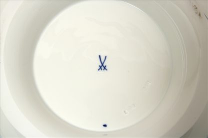 20. Jh. Porzellan. Barockform Neuer Ausschnitt mit blauem Zwiebelmuster. Runde Deckelterrine mit reliefierten Handhaben und Deckel mit Putto mit Füllhorn. Unterglasurblaue Schwertermarke mit Schleifstrich, Malermarke und Formnummer. Größe ca. 32 x 25 cm, Höhe ca. 22 cm. Schöner Zustand.