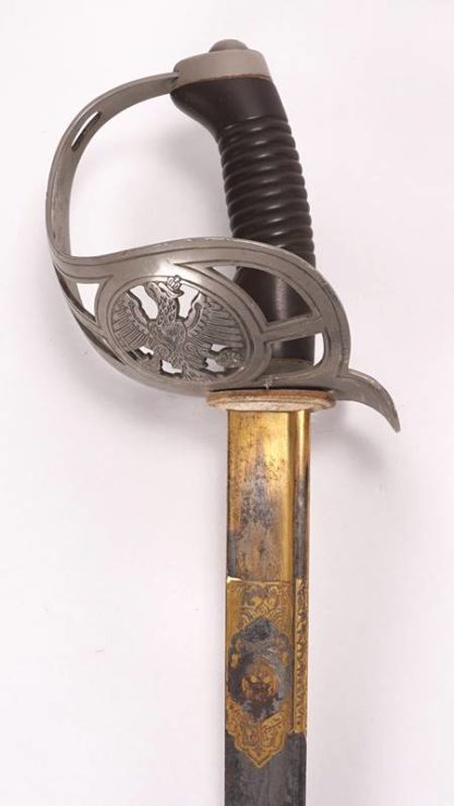 Degen Deutsch 1870. Husarenregiment Berlin/Brandenburg. Bakelitgriff und Metallkorb durchbrochen, mit Wappenzier, wohl erneuert. Damaszierte Schneide mit Goldtauschierung. Totenkopf auf einer Seite, florale Ornamentik auf der anderen. Auf dem Klingenrücken Bezeichnung 15. Gesamtlänge ca. 95 cm, Klinge ca. 81 cm. Gewicht ca. 820 Gramm. Altersbedingter Zustand.