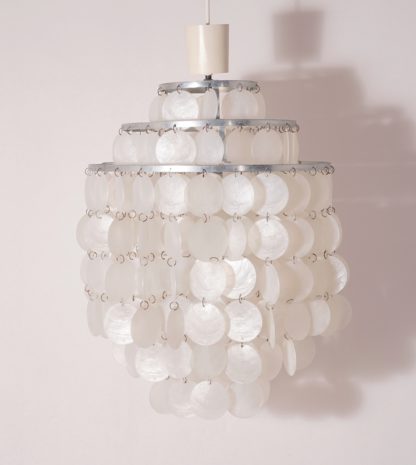 Panton, Verner 1926 Gamtofte Sogn - 1998 Kopenhagen. Deckenleuchte aus der Fun Serie. Dreistufig mit Plastikplättchen in Perlmutoptik. Durchmesser ca. 40 cm, Höhe ca. 60 cm. Panton, Verner 1926 Gamtofte Sogn - 1998 Copenhagen. Ceiling lamp from the Fun series. Three-tiered with plastic plates in mother-of-pearl look. Diameter ca. 40 cm, height ca. 60 cm.