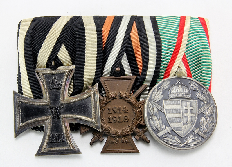 Kleine Ordensspange Deutsch/ Ungarn WK I. Drei Orden. Eisernes Kreuz 1914 2. Klasse, ein Ehrenkreuz des WK I, dazu eine ungarische Weltkriegserinnerungsmedaille.