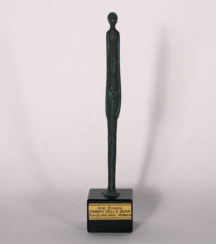 Museumsreplik nach etruskischem Original Ombra della sera. Stehender Jüngling, die Arme am Körper. Bronze auf rechteckigem Sockel, hier bezeichnet. Höhe der Figur ca. 11 cm, Gesamthöhe ca. 13 cm. Zustand wie abgebildet.