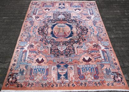 2. Hälfte 20. Jahrhundert. Sir Haki Stil mit vielen Feldern in Orange- und Blautönen. Größe ca. 284 x 198 cm, Knüpfdichte ca. 25 Knoten/qcm. Gewicht ca. 23 Kilogramm. Schöner Zustand.