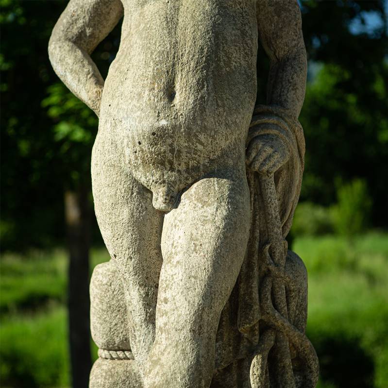 Kindlicher Hermes aus Steinguss als Gartenskulptur mit Äskulapstab und patinierter Oberfläche. Größe ca. 157 x 60 x 60 cm. Dieses Los wird ohne den Sockel angeboten. Dieses Los befindet sich an einem abweichenden Standort in Bayern und kann nicht besichtigt werden. Versand nicht möglich, nur Abholung.