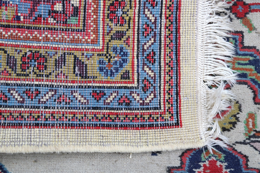 Vier Bordüren und Eckzwickeln an hellem Grund mit mehrteiligem Medaillon. Größe ca. 153 x 106 cm, ca. 9 Knoten/qcm, Gewicht ca. 4,5 Kilogramm. Zustand wie abgebildet.