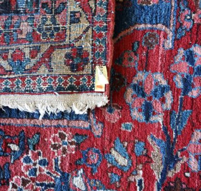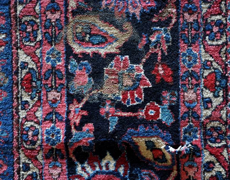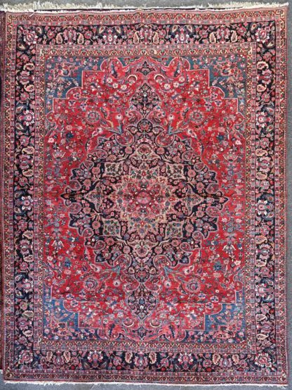 Wolle. Großes zentrales Medaillon auf rotgrundigem Innenfeld. Dieses mit Blumenranke gefüllt und mit Eckzwickeln. Von fünf Bordüren umgeben. Ca. 4 x 4 Knoten/qcm, Größe ca. 425 x 320 cm. Mit Brandfleck und Loch.