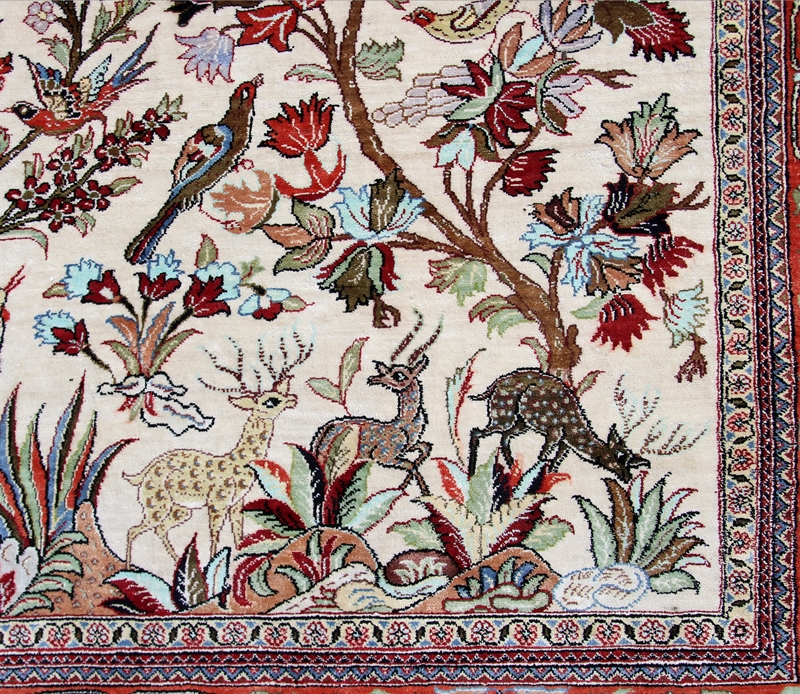 Ghom Signierter Seidenteppich mit sehr schön gearbeiteten Paradiesszenen mit zahlreichen Tieren und Vögeln. Größe ca. 152 x 106 cm, ca. 81 Knoten/qcm. Guter Zustand. Ghom. Signed silk carpet with very beautifully worked paradise scenes with numerous animals and birds. Size approx. 152 x 106 cm, approx. 81 knots/sq cm. Good condition.