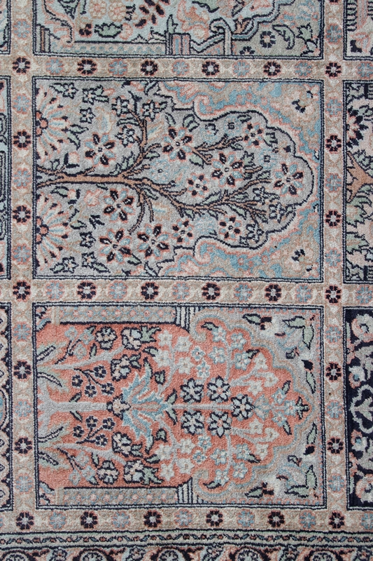 Ghom. 20th century. Divided border and inner section with 64 fields. Size approx. 282 x 370 cm, approx. 49 knots/sq cm. More heavily worn, partly faded.
