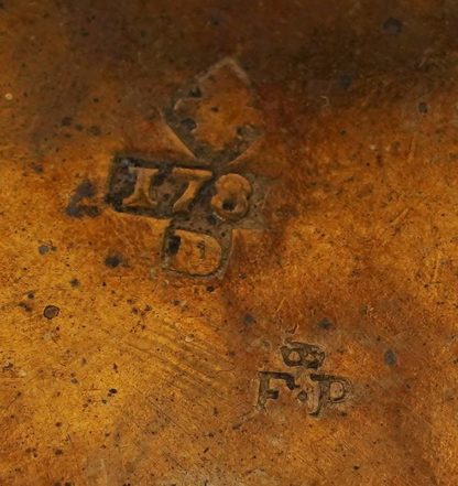 Goldwaage 18. Jh. Holzkästchen mit eiserner Balkenwaage mit zwei Messingschalen, Bechergewichte mit 7 Bechern sowie 4 Gewichtsscheiben. Jeweils mehrfach ungedeutet punziert 1786 F.P. u.a. Kästchengröße ca. 22 x 10,2 cm, Höhe ca. 4,4 cm.