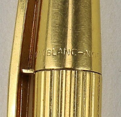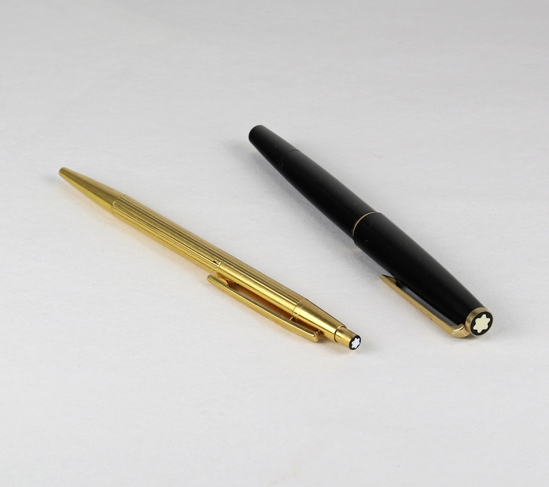 Frankreich 1970er Jahre. Ein Kolbenfüllfederhalter Nummer 320 aus schwarzem Kunstharz und vergoldetem Metall und einer Goldfeder. Auf der Feder punziert und auf dem Ring bezeichnet, Emblem oben auf der Kappe und auf der Unterseite. Ein goldplattierter Kugelschreiber der Noblesse Reihe. Emblem auf der Unterseite. Länge jeweils ca. 13,5 cm. Kappe des Füllers etwas lose, Kugelschreiber funktionsfähig.