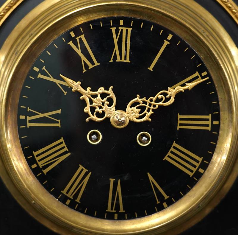 Frankreich, Japy Frères & Cie um 1885. Holzkorpus mit vorgesetzter, ebonisierter Front mit goldfarbenen Messingapplikationen in Form von Akanthusblättern und Karyatiden. Aufgesetztes schwarzes Ziffernblatt mit römischen Stundenzahlen und goldfarbenen Zeigern. Rundes Messingplatinenwerk mit Pendel an Federaufhängung und Schlüsselaufzug sowie Schlag zur vollen und halben Stunde auf Tonfeder. Auf der Platine mit Herstellermarke. Läuft an. Schlag reagiert, schlägt aber nicht. Schlüssel anbei. Größe ca. 88 x 29 cm.