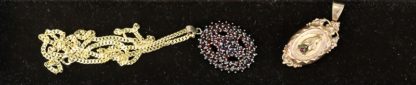 Erste Hälfte 20. Jh. Medaillonanhänger wohl Schaumgold, Granatanhänger undeutlich punziert und goldplattierte Kette.