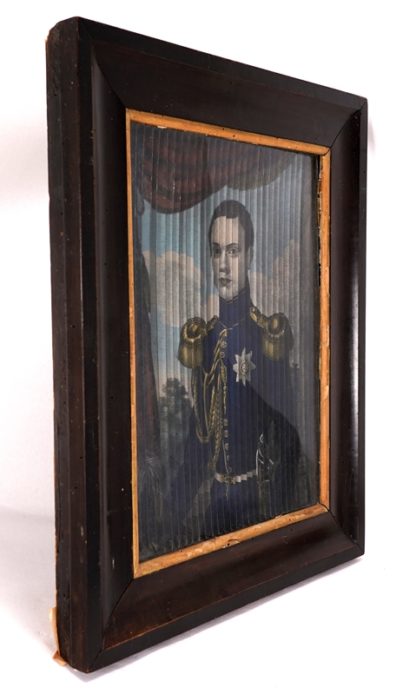 Seltenes militärisches Lamellenbild 18./19. Jh. Farbgraphiken. Auf dem Hauptbild ein hochdekorierter Offizier mit großen Prunkepauletten und Prunkkragen. Rote Schärpe und drei große Bruststerne. Auf der einen Seite der Lamelle ein jüngerer Offizier (wohl der Sohn) und auf der anderen Seite die Ehefrau bzw. Mutter. Größe 31 x 24 cm, hinter Glas gerahmt ca. 42,5 x 35,5 cm.