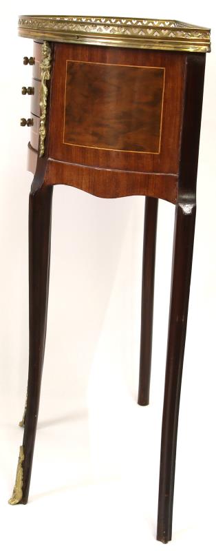 Napoleon III um 1900. Halbrunde Form auf ebonisierten Beinen mit dreischübigem Korpus und Messingapplikationen. Verschiedene Hölzer. Größe ca. 50 x 27 cm, Höhe ca. 72 cm.