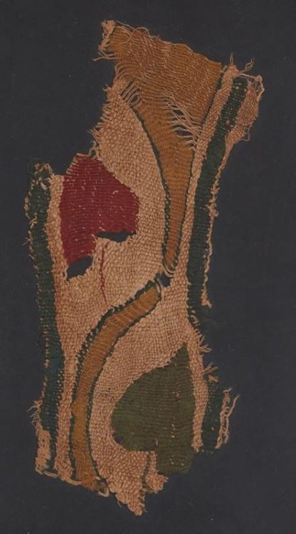 Koptisches Textilfragment Wohl Ägypten ca. 8.-10. Jh. Wollwirkerei auf Leinen. Bordüre mit Weinlaubranke in Rot, Grün und Gelb. Größe ca. 18 x 7 cm. Hinter Glas gerahmt.