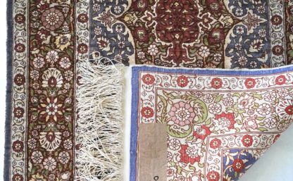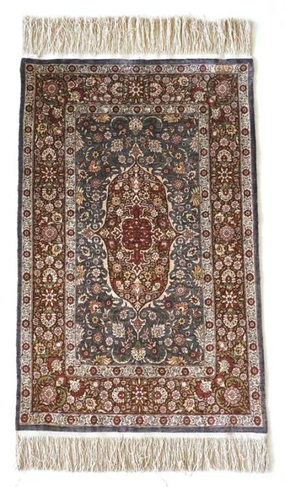 Persien 20. Jh. Seide. Dreifachbordüre mit floraler Ornamentik. Floralgemustertes Innenfeld mit zentralem Medaillon. Größe ca. 97 x 63 cm, Knoten/qcm ca. 9 x 9.