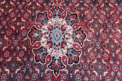 Persien 20. Jh. Fünffachbordüre und floral gemustertes Innenfeld mit Eckzwickeln und Medaillon. Blau- und Rottöne. Größe ca. 270 x 166 cm, ca. 20 Knoten/qcm, Gewicht ca. 20 Kilogramm.