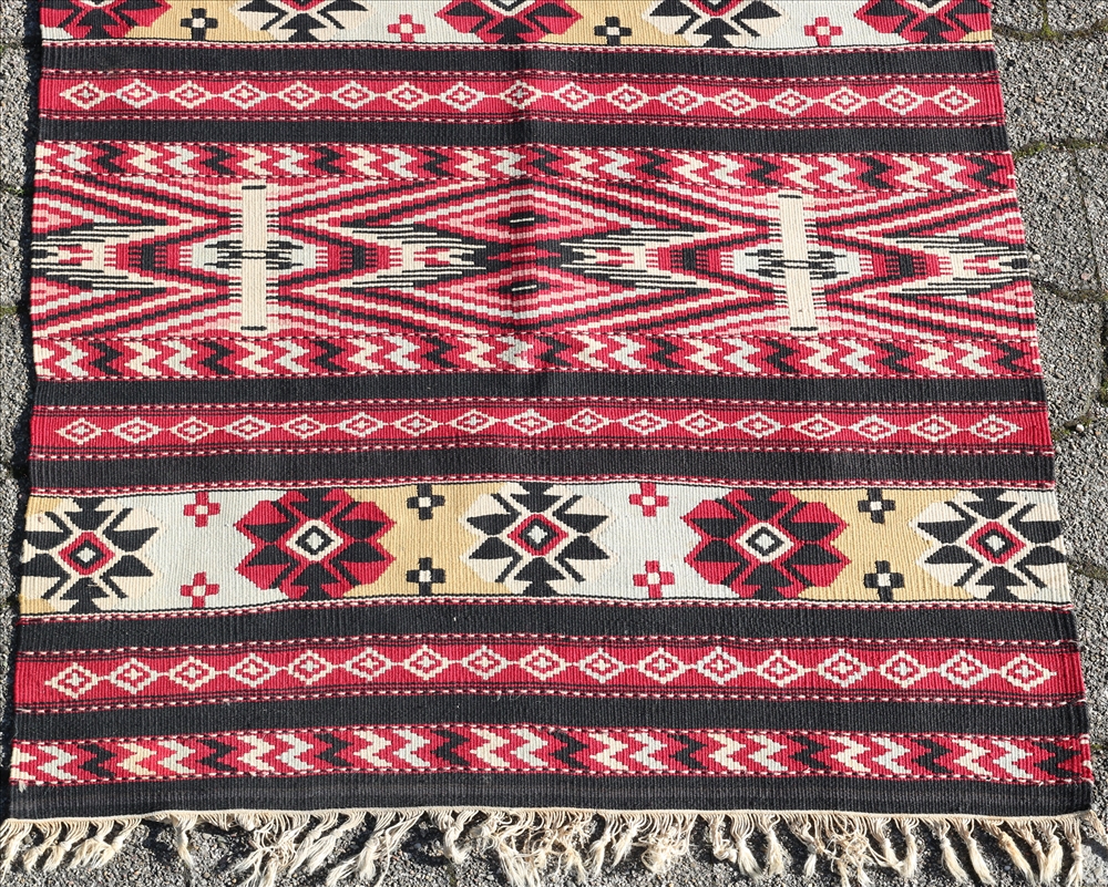 20. Jh. Mehrere Streifen mit geometrischen Mustern. Größe ca. 145 x 79 cm, ca. 6 Knoten/qcm, Gewicht ca. 1,6 Kilogramm.