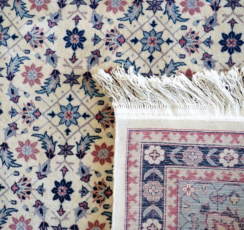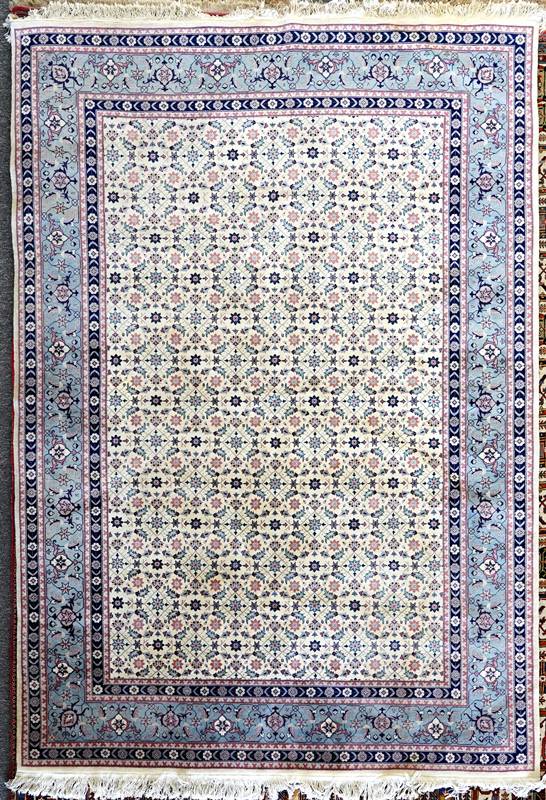 Wolle. Innenfeld mit Blumenmuster auf weißem Grund. Umgeben von drei Bordüren auf dunkel- und hellblauem Grund mit Blumenfries. Ca. 5 x 5 Knoten/qcm, Größe ca. 310 x 215 cm. Teils vergilbt.