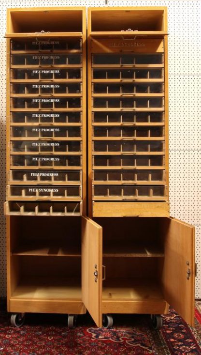Alte Garnschränke der Freiburger Garnfabrik MEZ um 1930. Diverse Auszüge und Türen. Größe ca. 37 x 37 cm, Höhe ca. 148 cm. Zustand wie abgebildet mit Gebrauchsspuren, eine Blende fehlt, die Rollen wohl später.